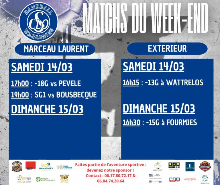 Actualités Programme du Week-endLire La Suite… 12 mars 2026 Revanche en vue à Marceau Laurent : le CLOS Wahagnies veut continuer sa marche en avantLire La Suite… 11 mars 2026 Le handball wahagnisien entre victoires et frustrations pour la reprise.Lire La Suite… 9 mars 2026 Programme du week-endLire La Suite… 5 mars 2026 Match of the WeekLire La Suite… 4 mars 2026 Il y a des matchs qu’on laisse filer dans l’ombre …Lire La Suite… 2 mars 2026 Fin de parcoursLire La Suite… 24 février 2026 1 2 3 … 9 ›