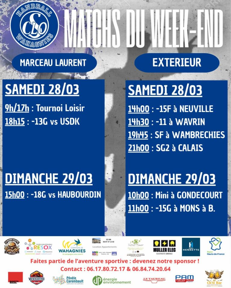 Actualités Week-end contrasté pour le handball wahagnisien, mais riche en enseignements et en émotions !Lire La Suite… 30 mars 2026 Week-end des 28 et 29 mars : un club entre pause et défisLire La Suite… 26 mars 2026 Un défi majuscule pour les -13 garçons face à l’USDKLire La Suite… 25 mars 2026 Tournoi LoisirLire La Suite… 24 mars 2026 Week-end contrasté pour le CLOS Wahagnies Handball : entre confirmations et frustrationsLire La Suite… 23 mars 2026 Alerte HandballLire La Suite… 21 mars 2026 Programme du Week-endLire La Suite… 19 mars 2026 1 2 3 … 10 ›